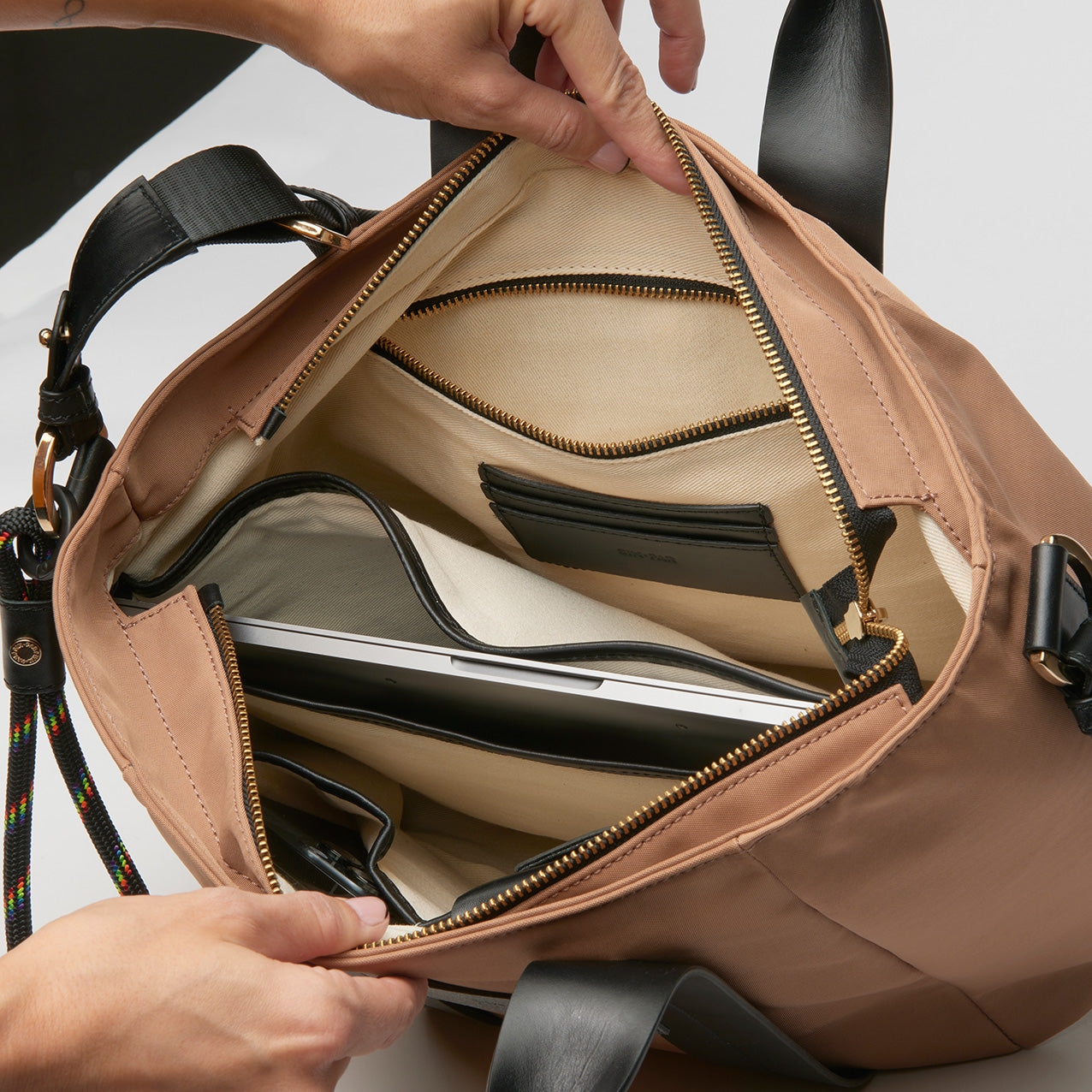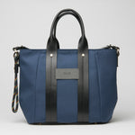 Recycled nylon tote bag with a zip fastening, an external magnetic pocket and a padded compartment for a 13” laptop. Multiple internal compartments, premium eco-leather handles and a removable nautical charm. 100% handcrafted in Spain.