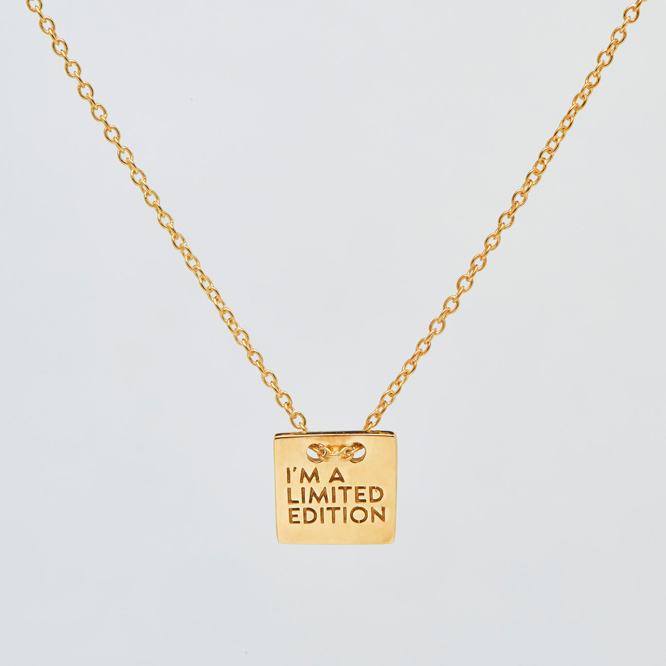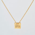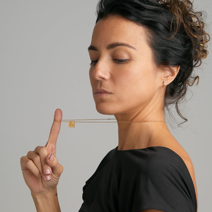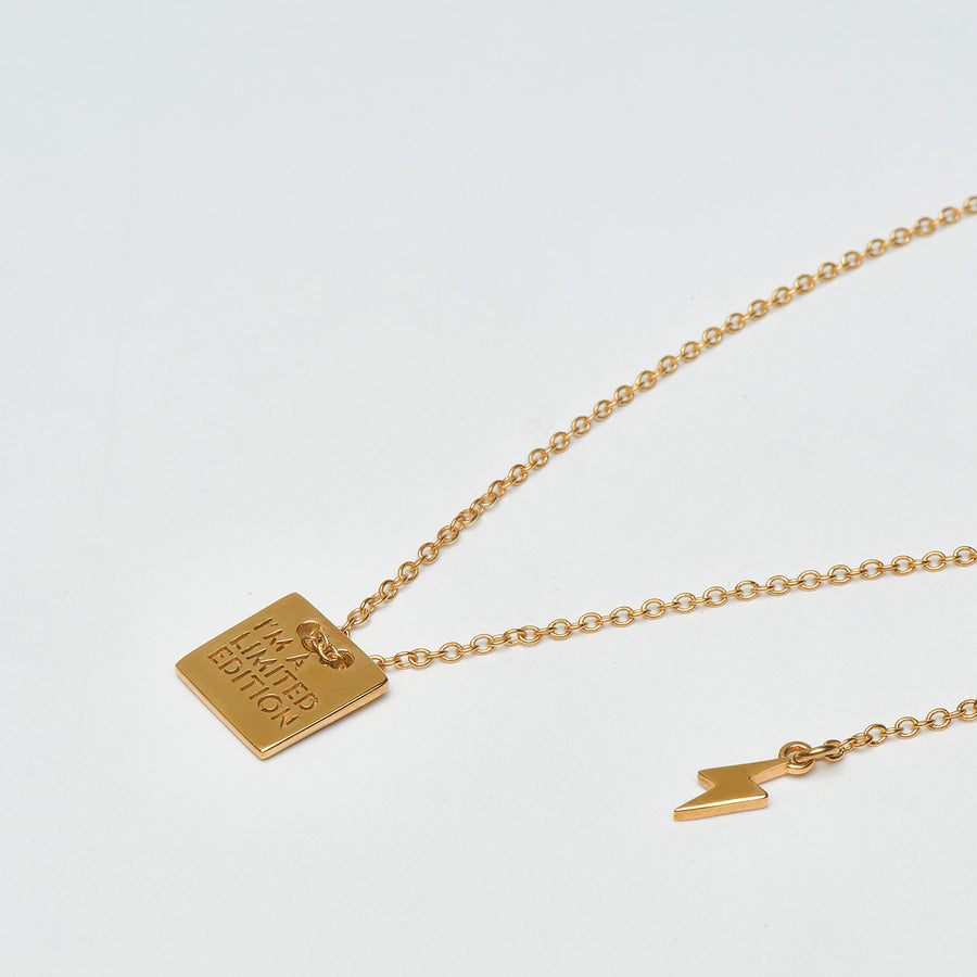 A necklace featuring our exclusive design, composed of a square plate with a engraved SIN·PAR message, 3 micron gold plated and vintage finish. The chain consists of 4 links, allowing foe easy adjustment to the desired size. It is completed with a lightning bolt finish (our logo) at the end of the chain.