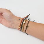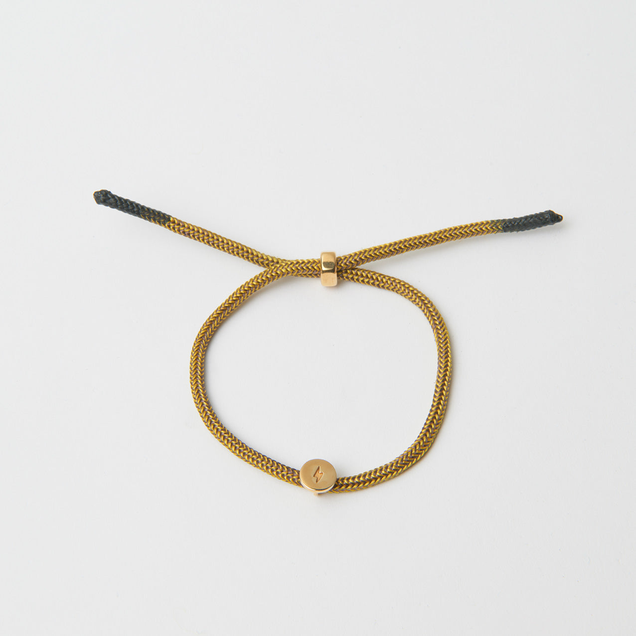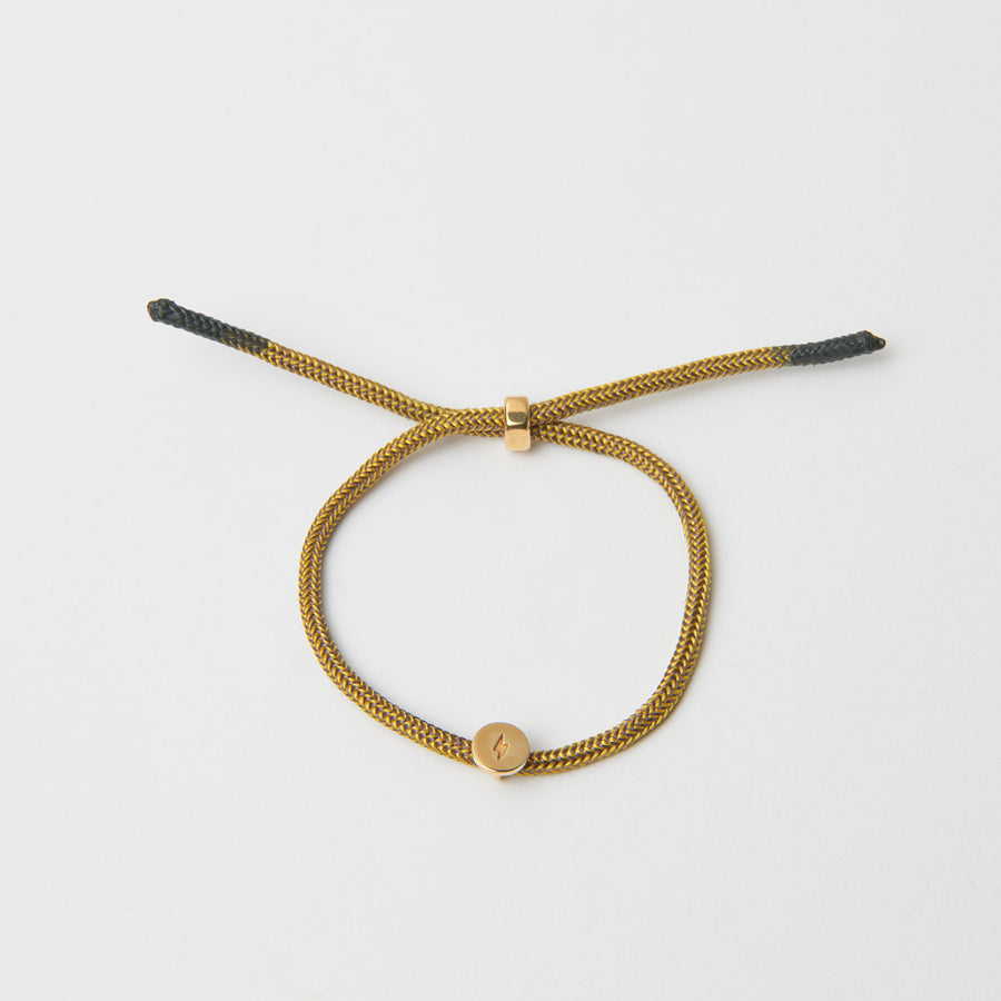 A unisex bracelet crafted from super-resistent rope used in sailboats, featuring an engraved plate with lightning logo, gold-plated 3 microns. The bracelet comes with a nut adjuster, also gold-plated 3 microns, making it very easy to put on and take off. Suitable for all types of wrists, it has a black rubberized finish to secure the ends of the rope.