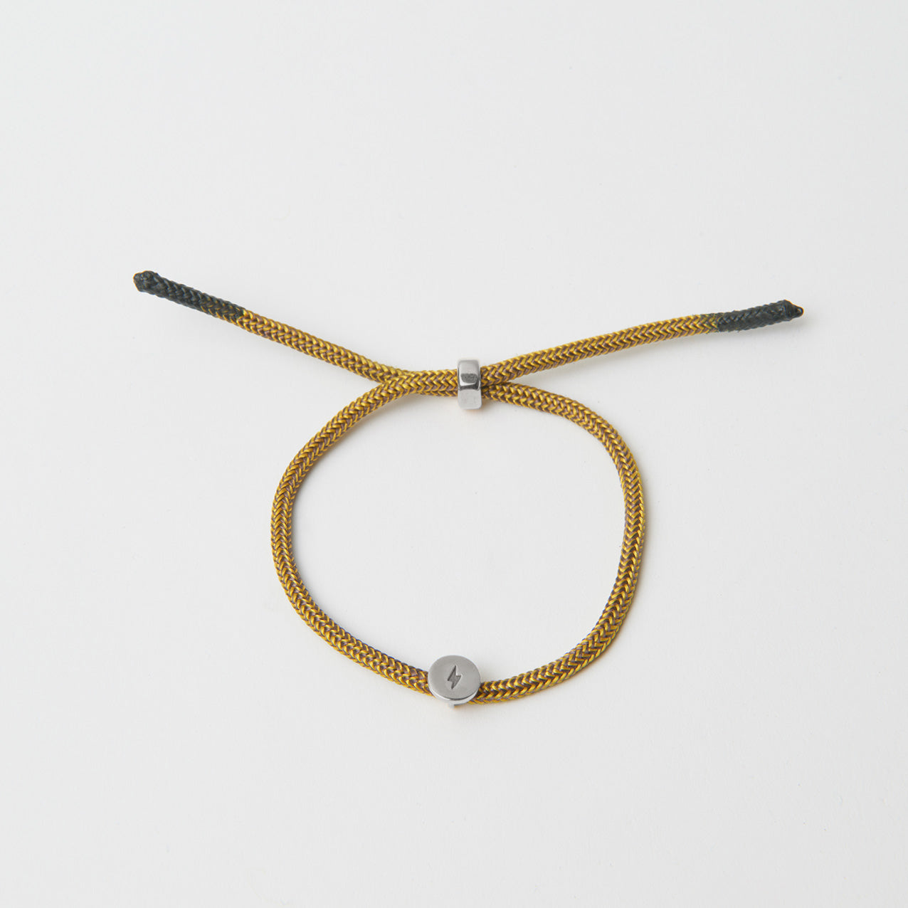 A unisex bracelet crafted from super-resistent rope used in sailboats, featuring an engraved plate with lightning logo, antique silver plated. The bracelet comes with a nut adjuster, also antique silver plated, making it very easy to put on and take off. Suitable for all types of wrists, it has a black rubberized finish to secure the ends of the rope.