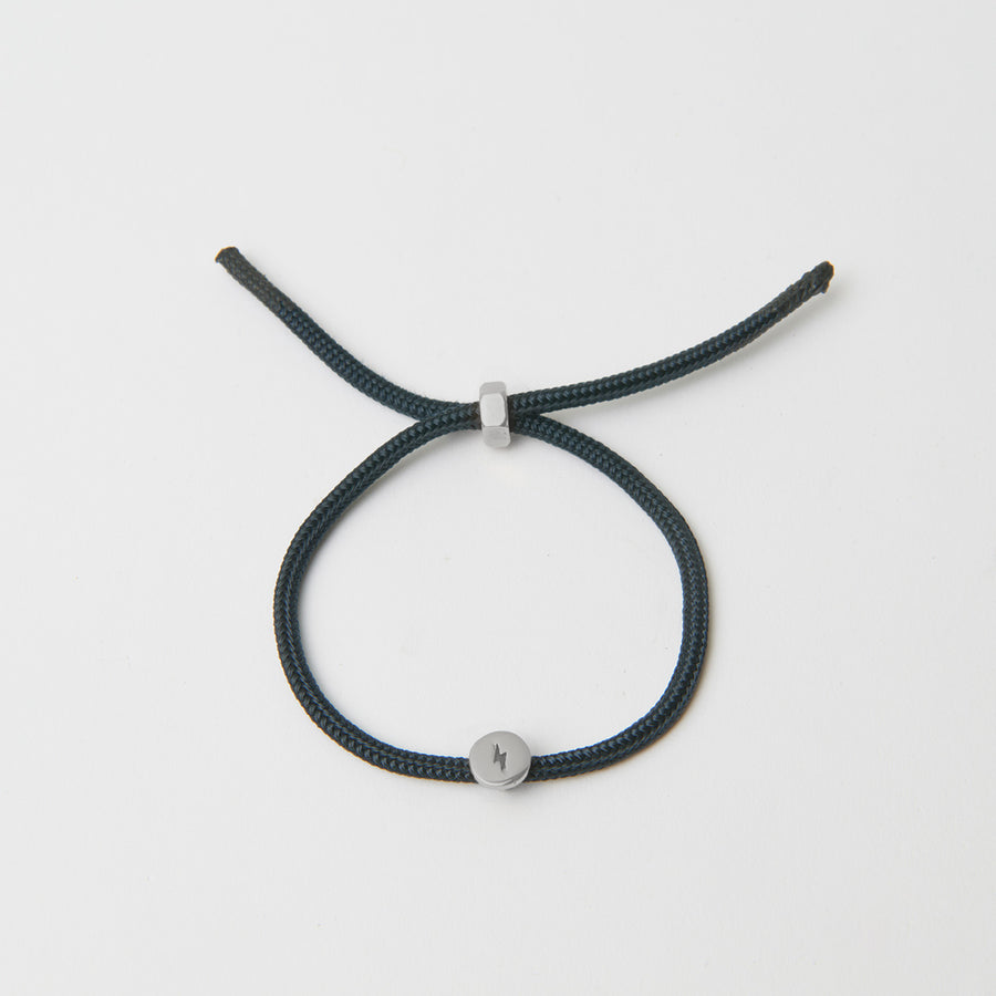 A unisex bracelet crafted from super-resistent rope used in sailboats, featuring an engraved plate with lightning logo, antique silver plated. The bracelet comes with a nut adjuster, also antique silver plated, making it very easy to put on and take off. Suitable for all types of wrists, it has a black rubberized finish to secure the ends of the rope.