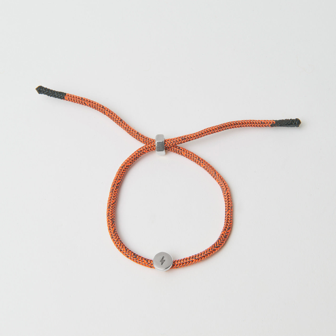 A unisex bracelet crafted from super-resistent rope used in sailboats, featuring an engraved plate with lightning logo, antique silver plated. The bracelet comes with a nut adjuster, also antique silver plated, making it very easy to put on and take off. Suitable for all types of wrists, it has a black rubberized finish to secure the ends of the rope.