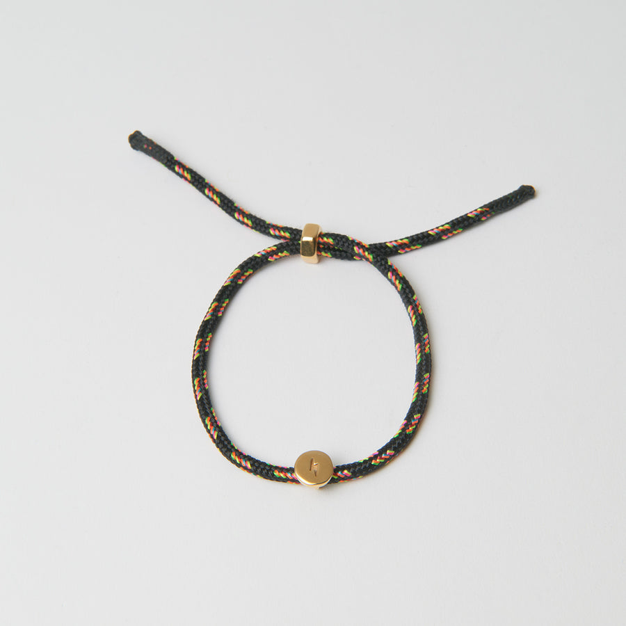 A unisex bracelet crafted from super-resistent rope used in sailboats, featuring an engraved plate with lightning logo, gold-plated 3 microns. The bracelet comes with a nut adjuster, also gold-plated 3 microns, making it very easy to put on and take off. Suitable for all types of wrists, it has a black rubberized finish to secure the ends of the rope.
